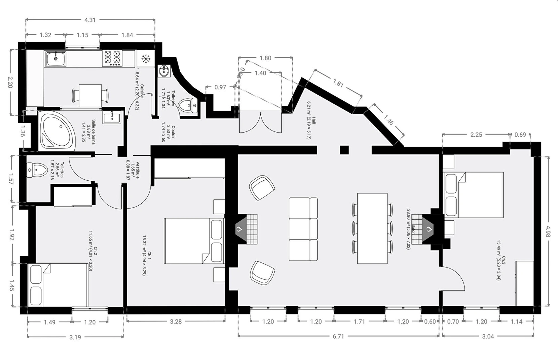 L'appartement se compose d'une entrée, d'un vaste double séjour baigné de soleil, de trois chambres confortables, d'une cuisine indépendante, d'une salle de bains et de toilettes séparées.